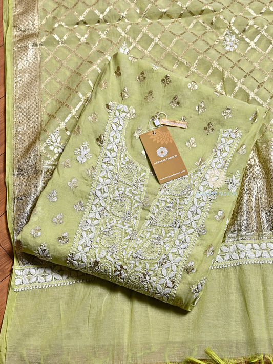 Fabric: 100% Pure Chanderi Color: Pista Green with white and golden detailing Embroidery: Handcrafted Lucknowi...