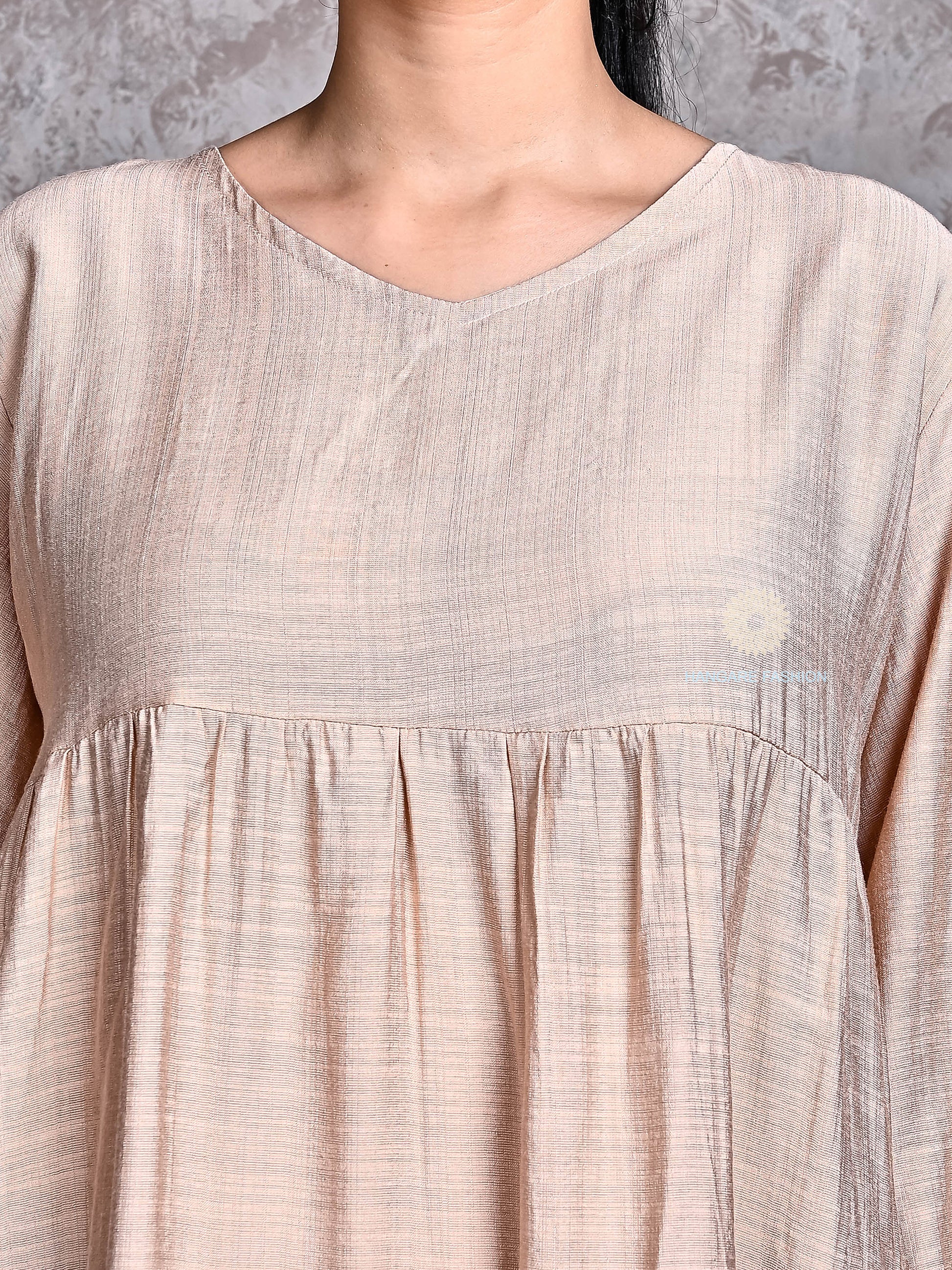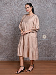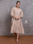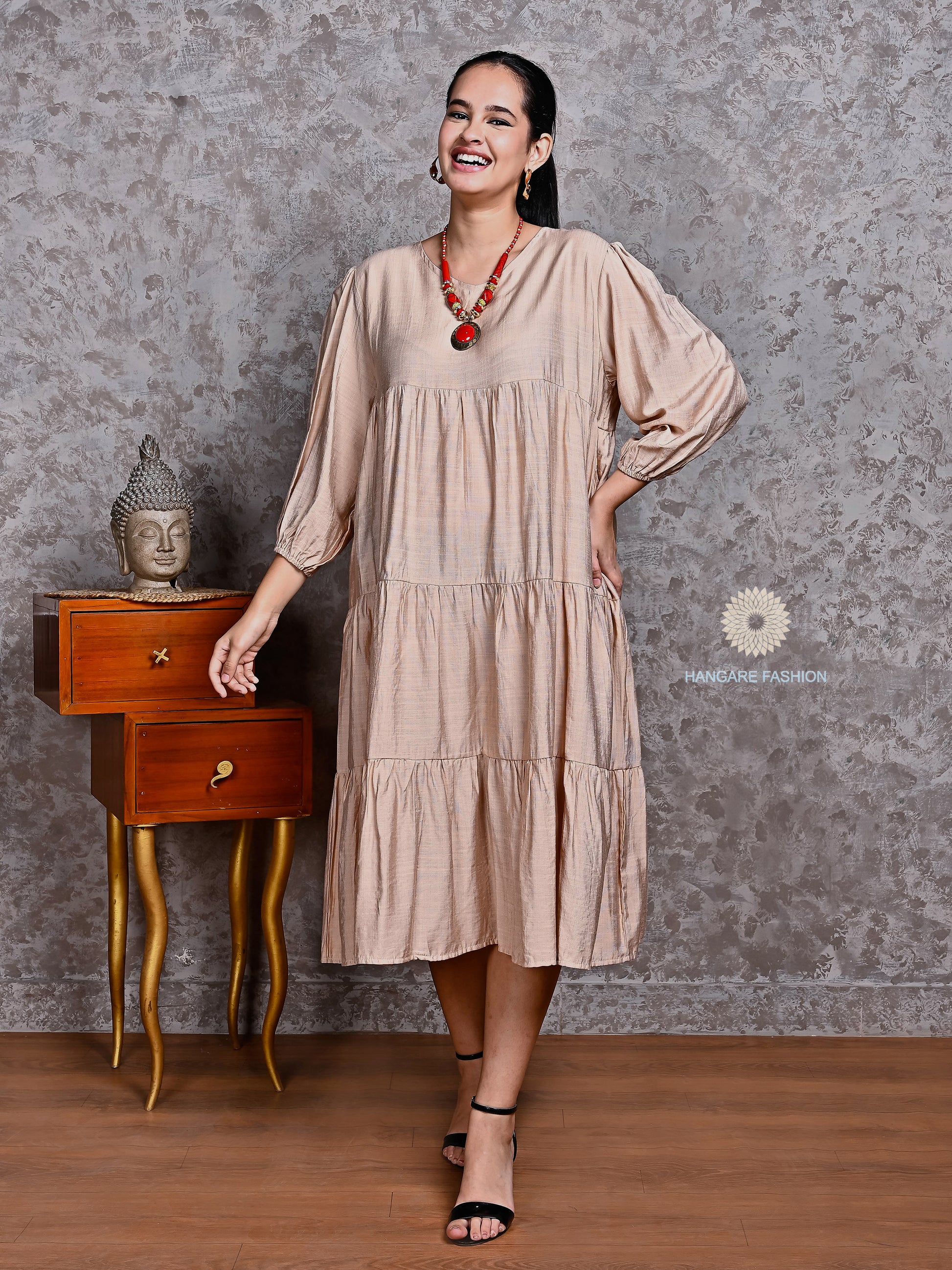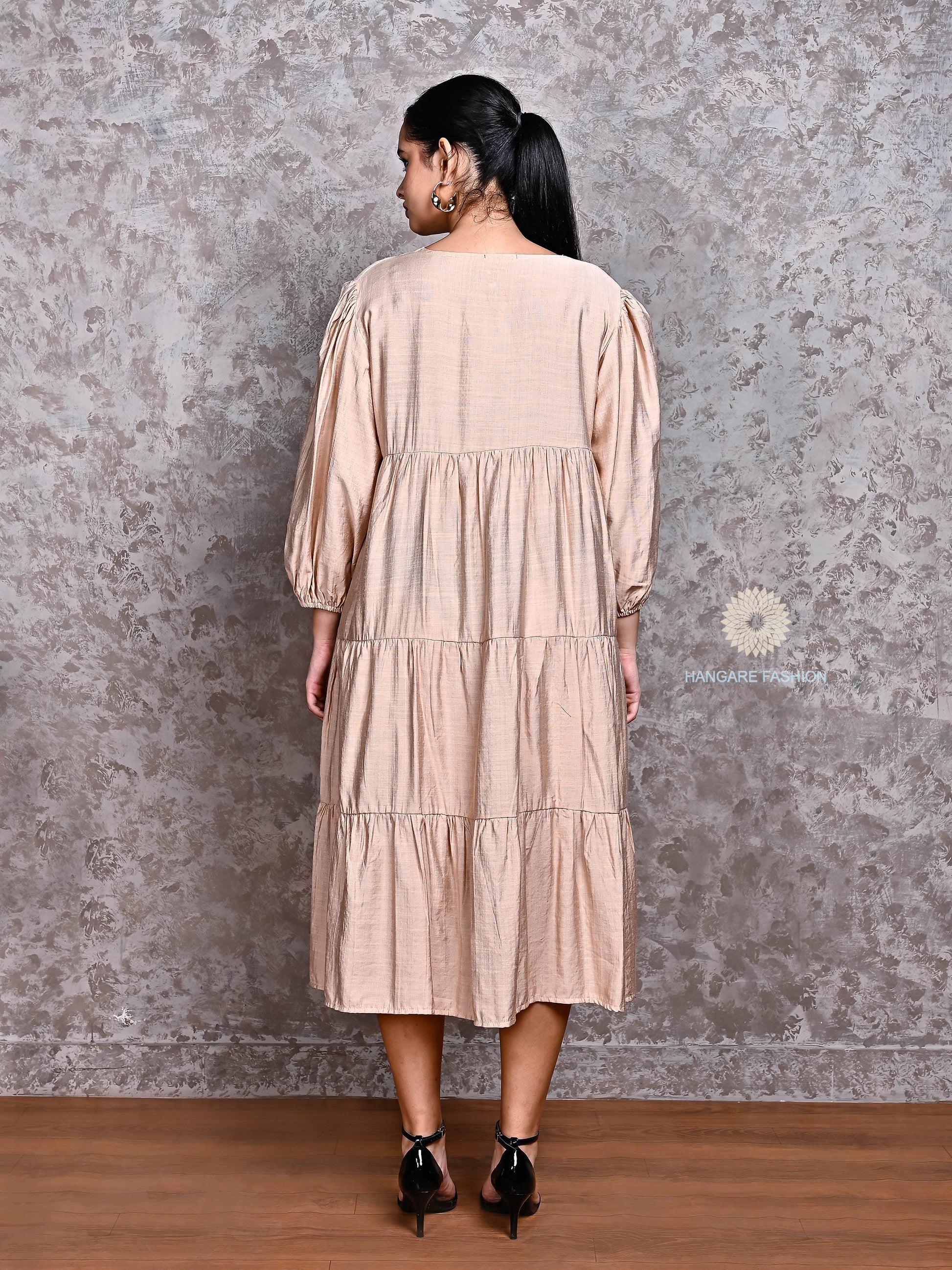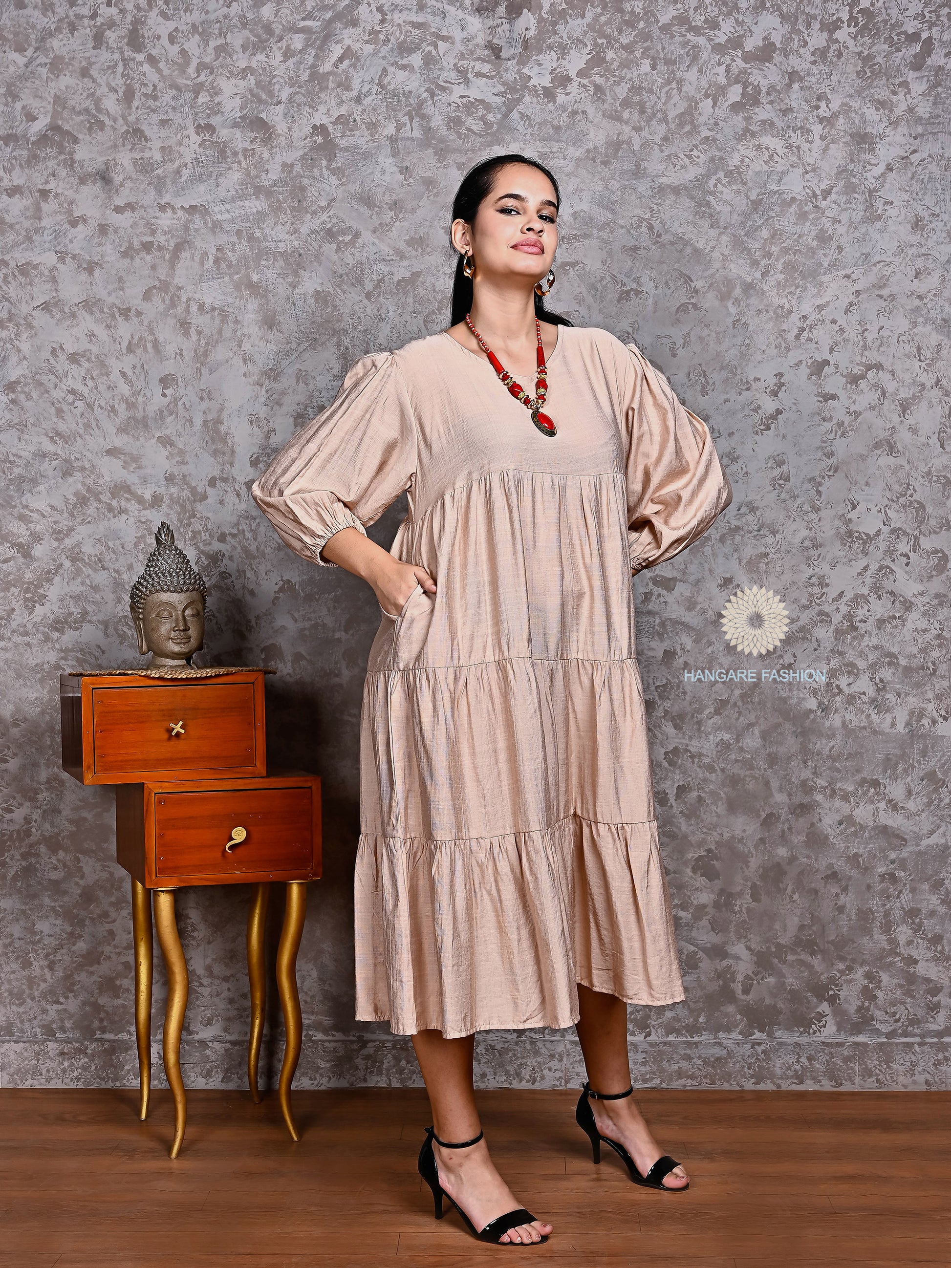 Champagne Beige Cotton Blend Tiered Midi Dress