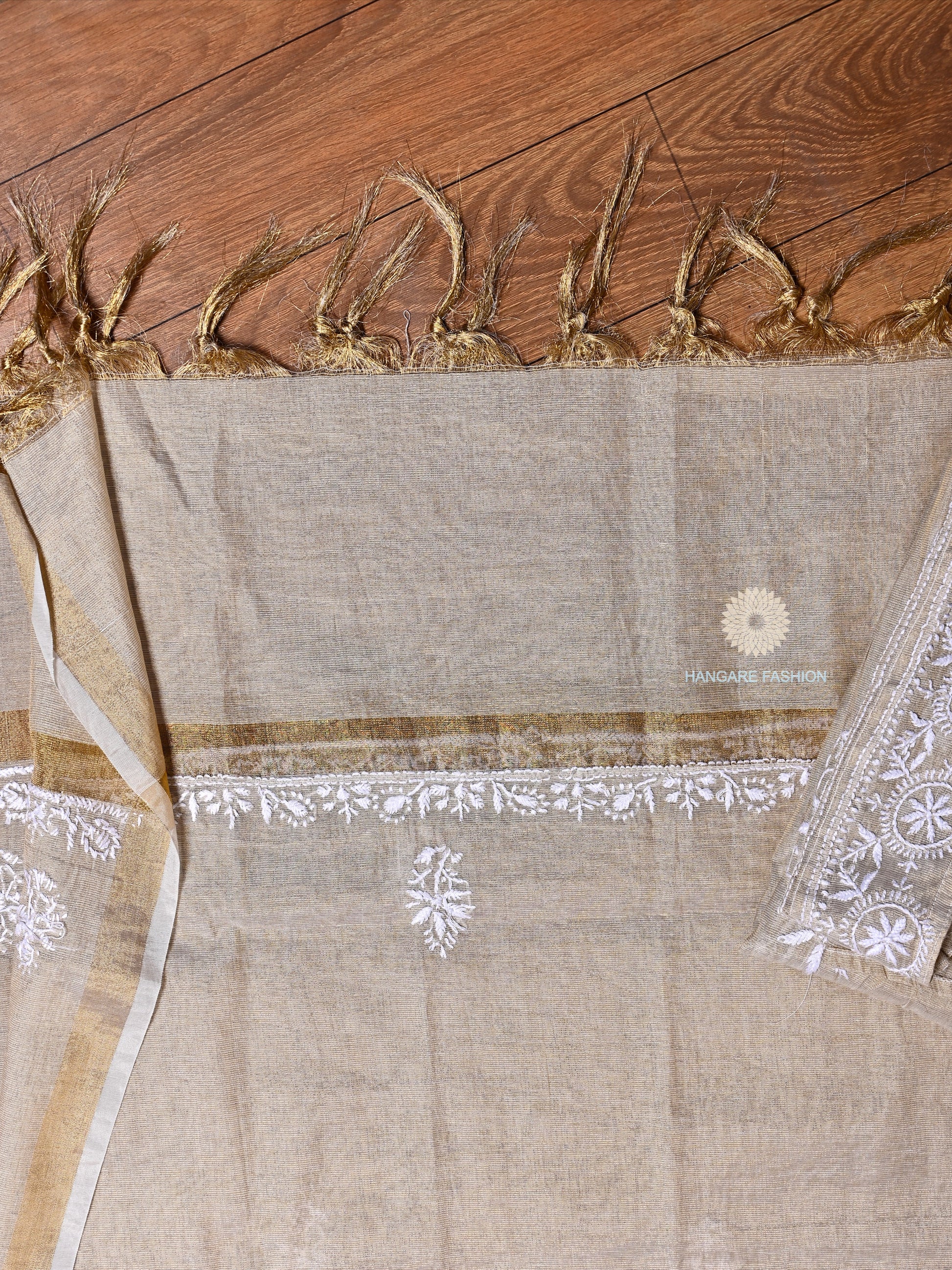 Champagne Beige Pure Tissue Chikankari Shirt & Dupatta Set