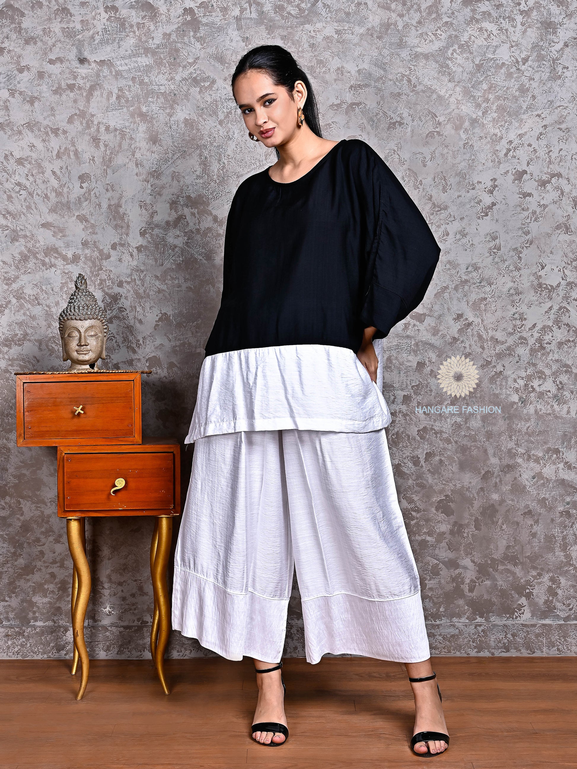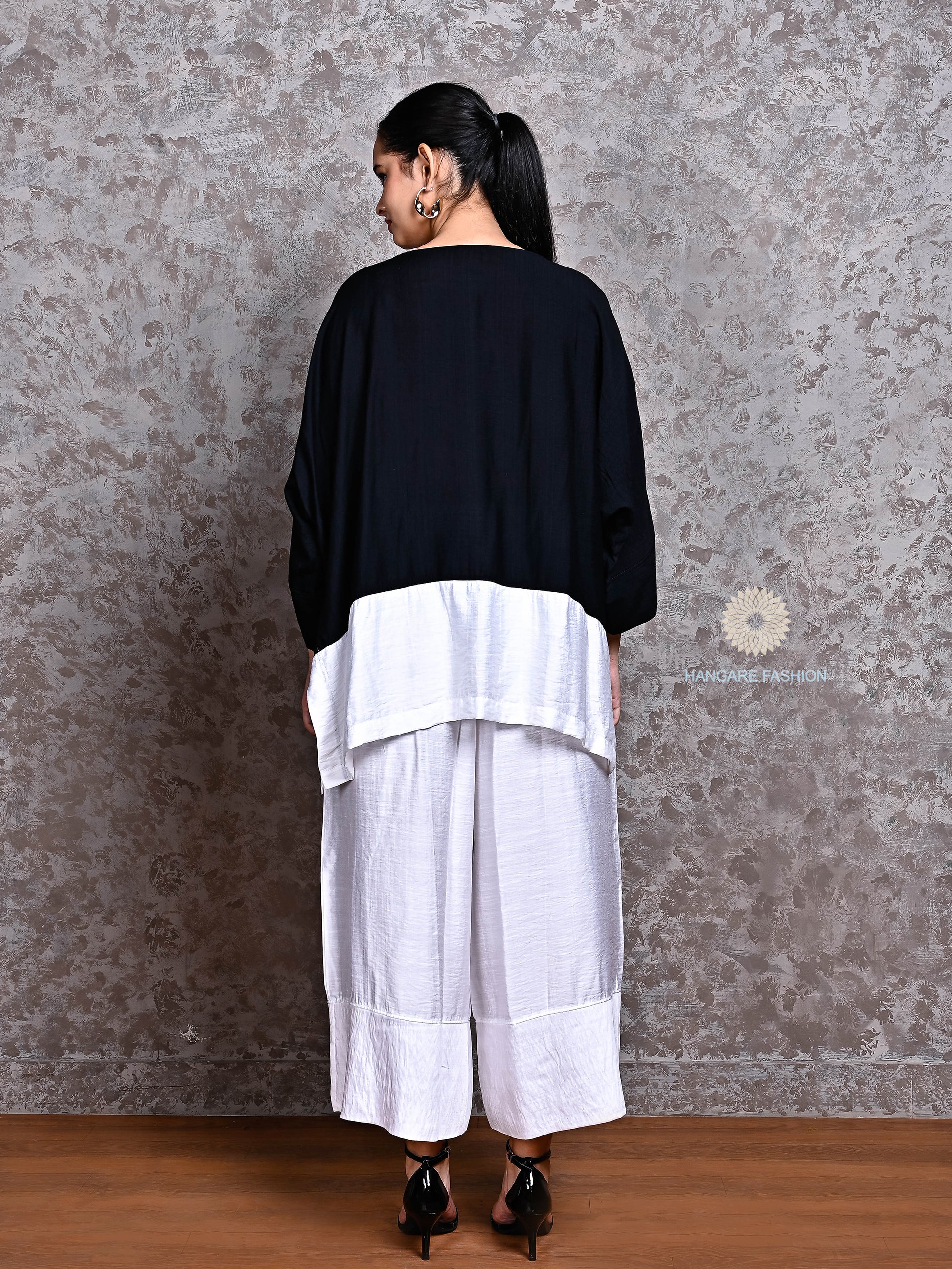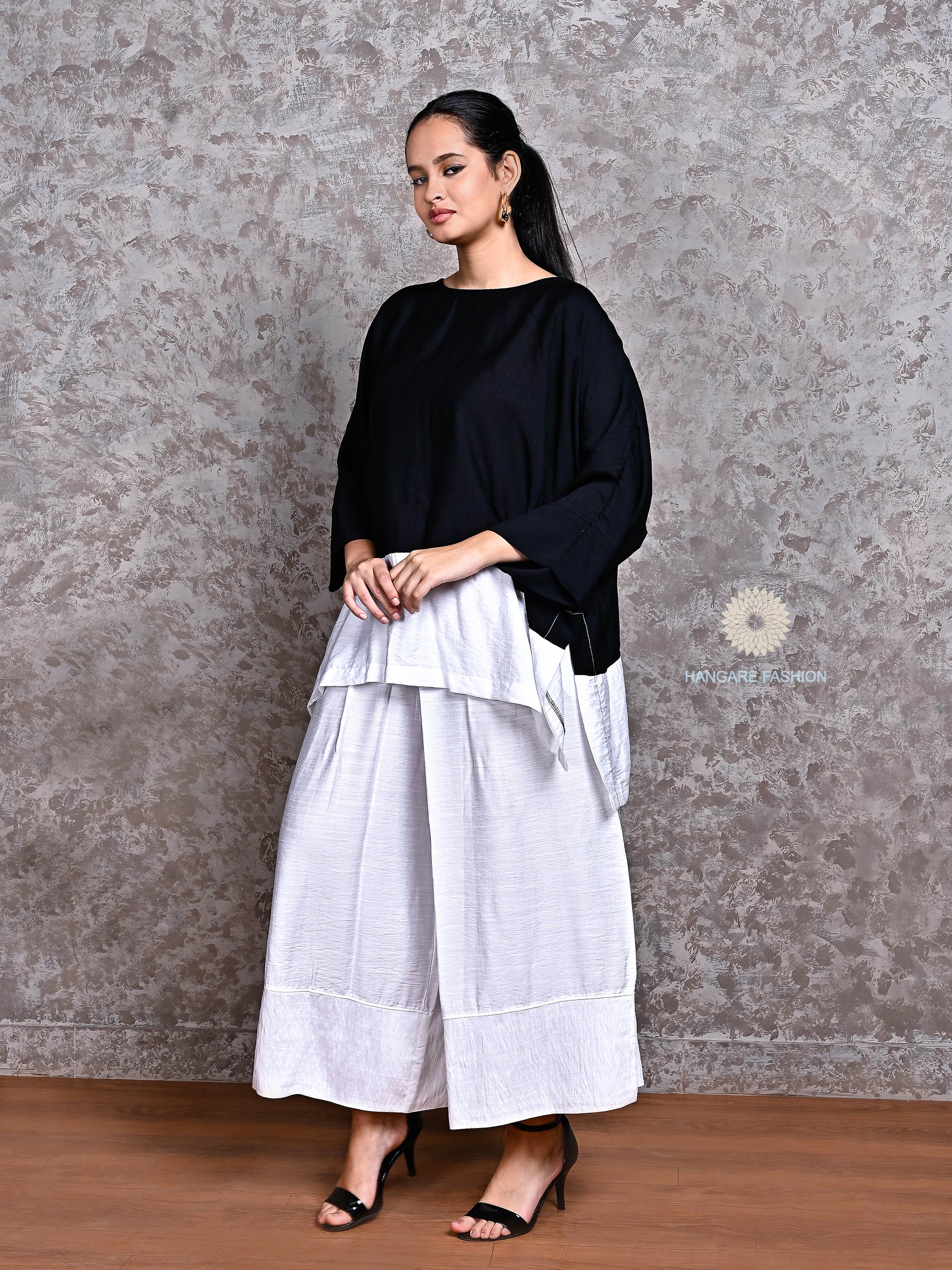 Sophisticated Color-Block Aesthetic – Striking reversal of tones with a solid black top and crisp white wide-leg pants.