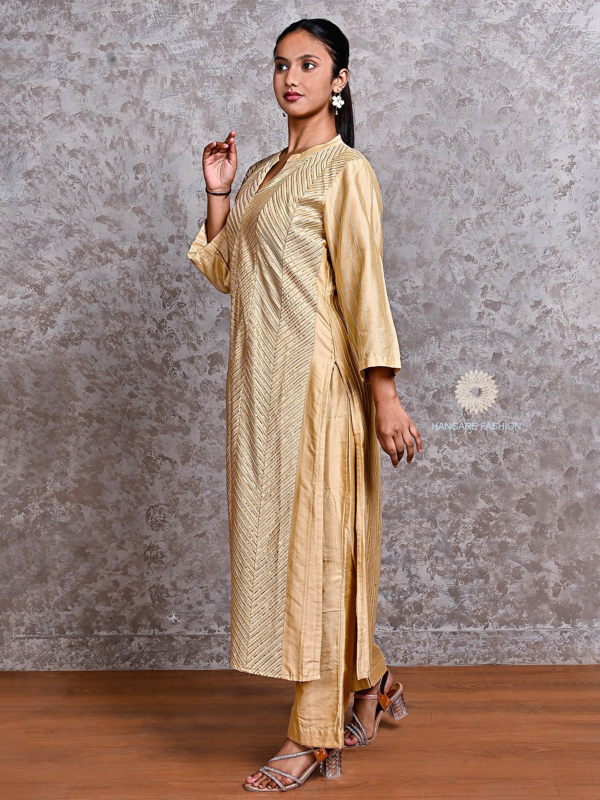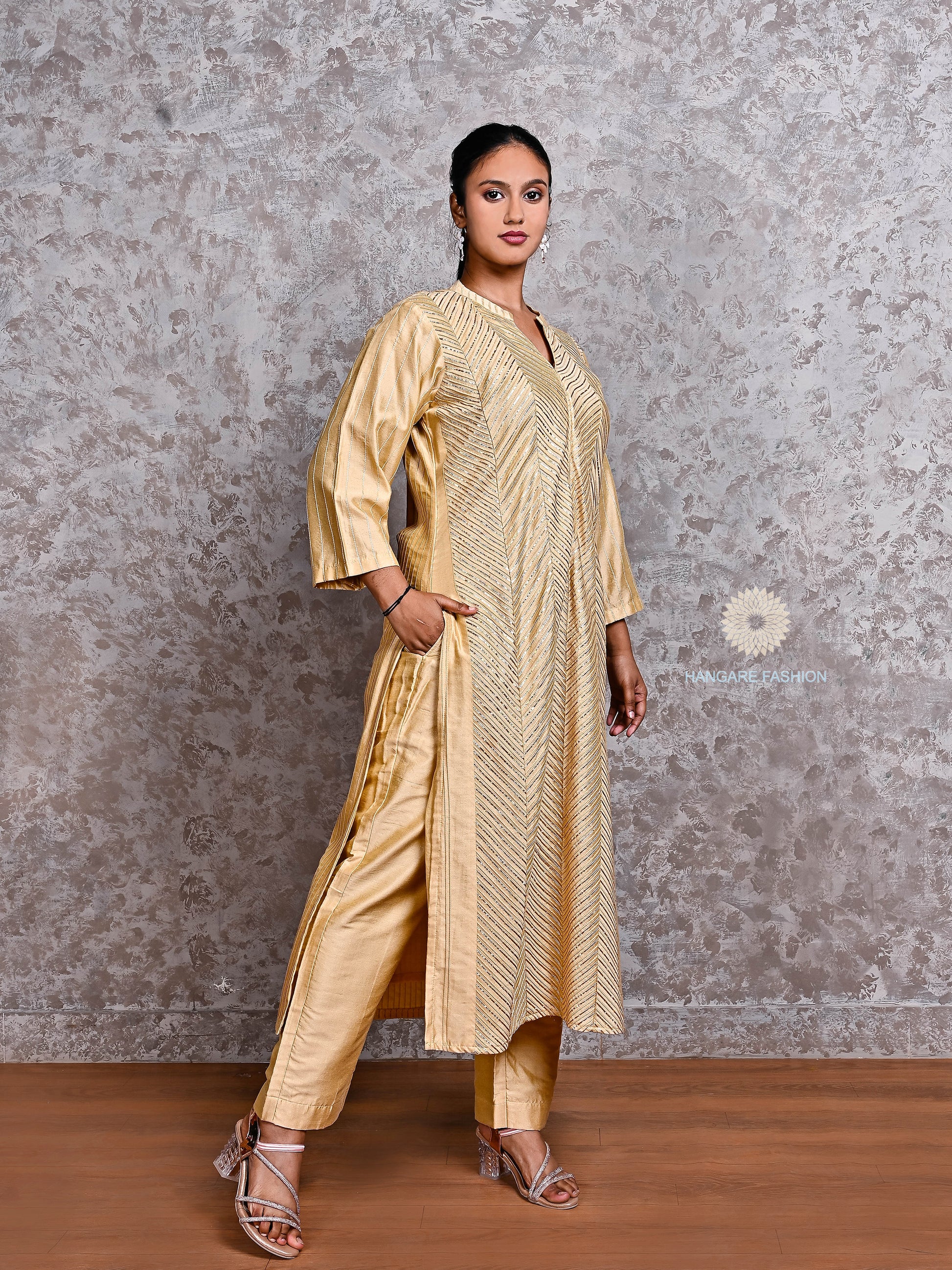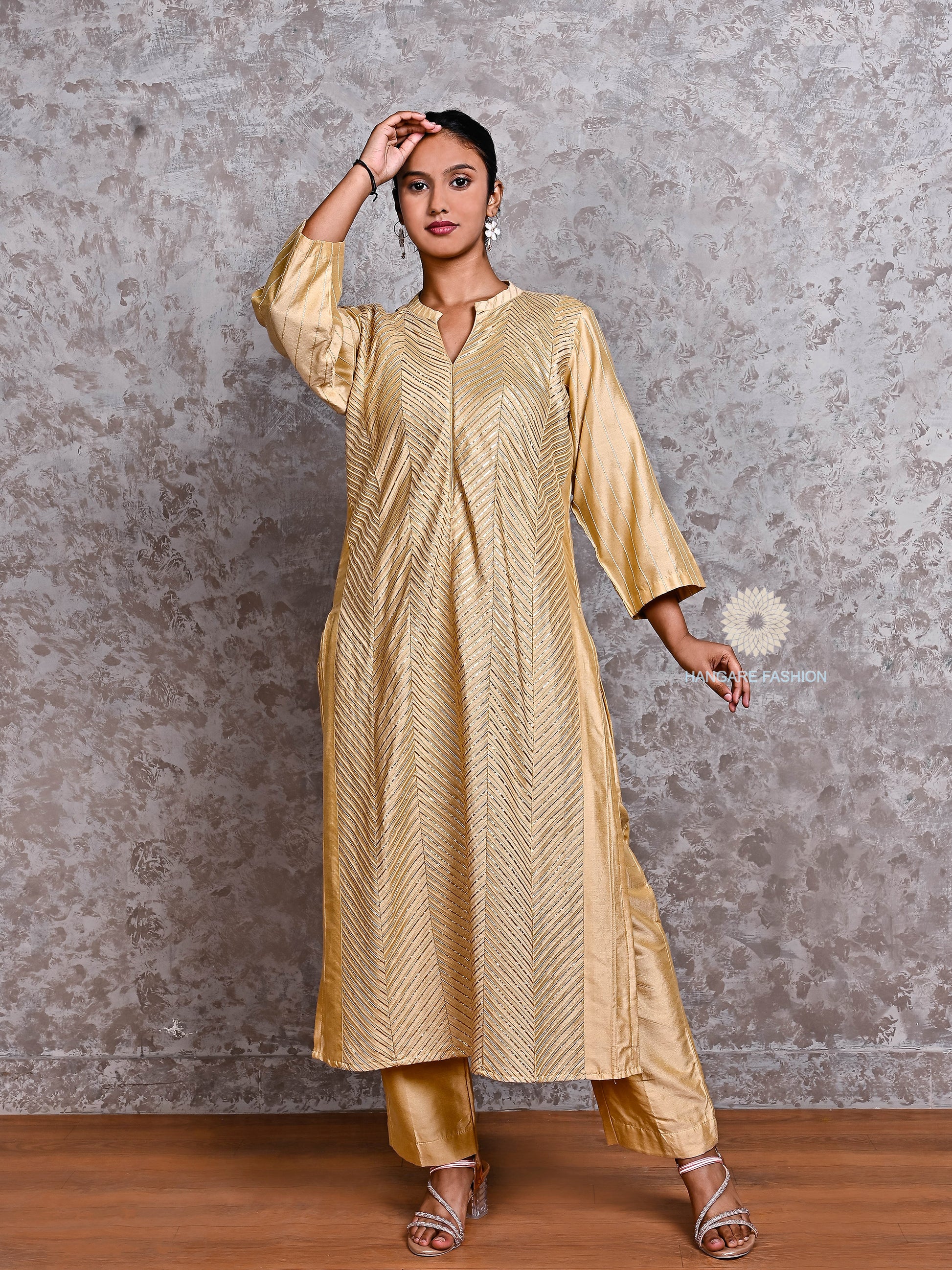 Golden Cotton Silk Stitched Suit with Gota Patti & Dupatta