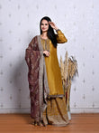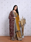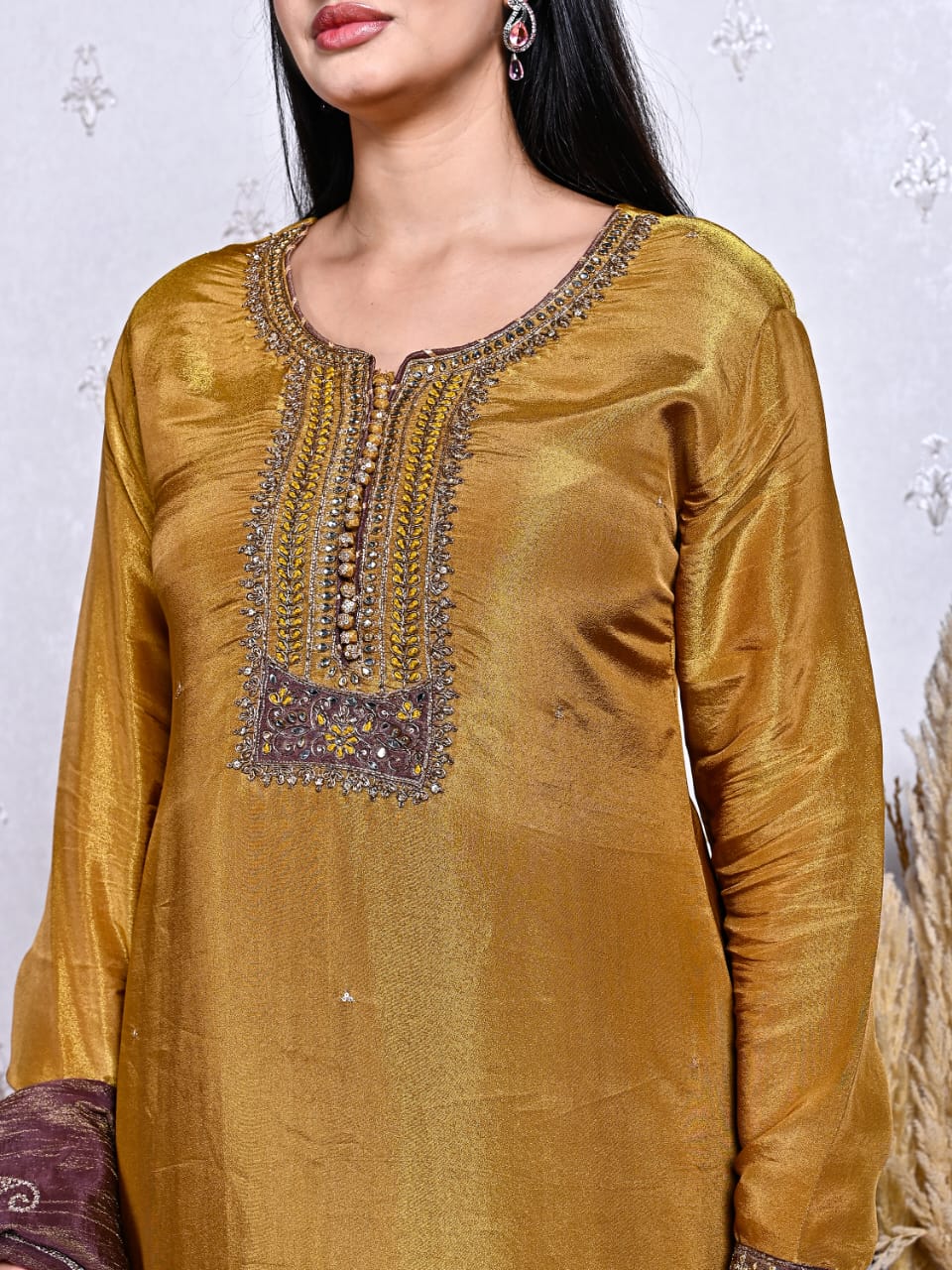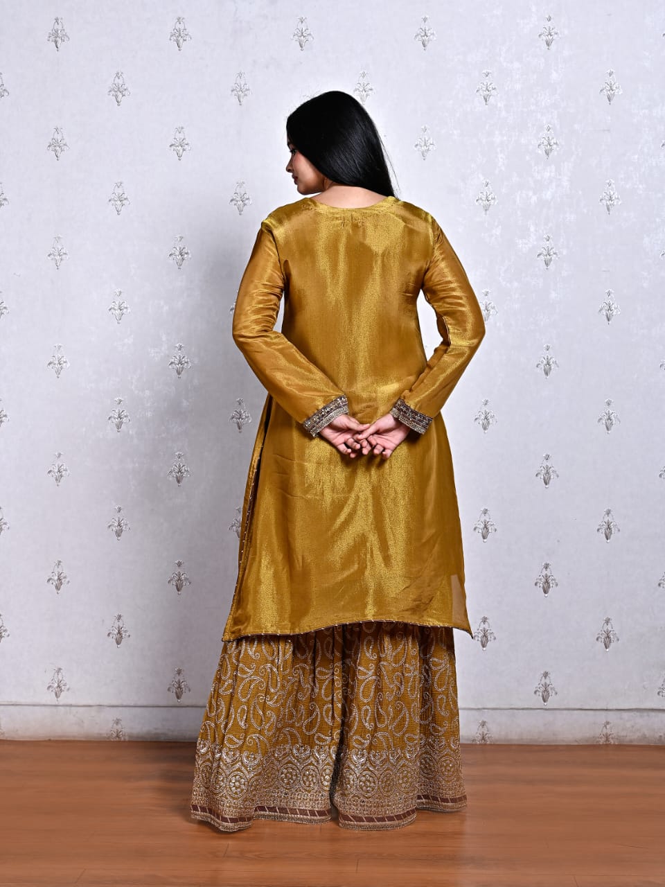 Golden Mustard Tissue Shimmer Sharara Set with Maroon Dupatta
