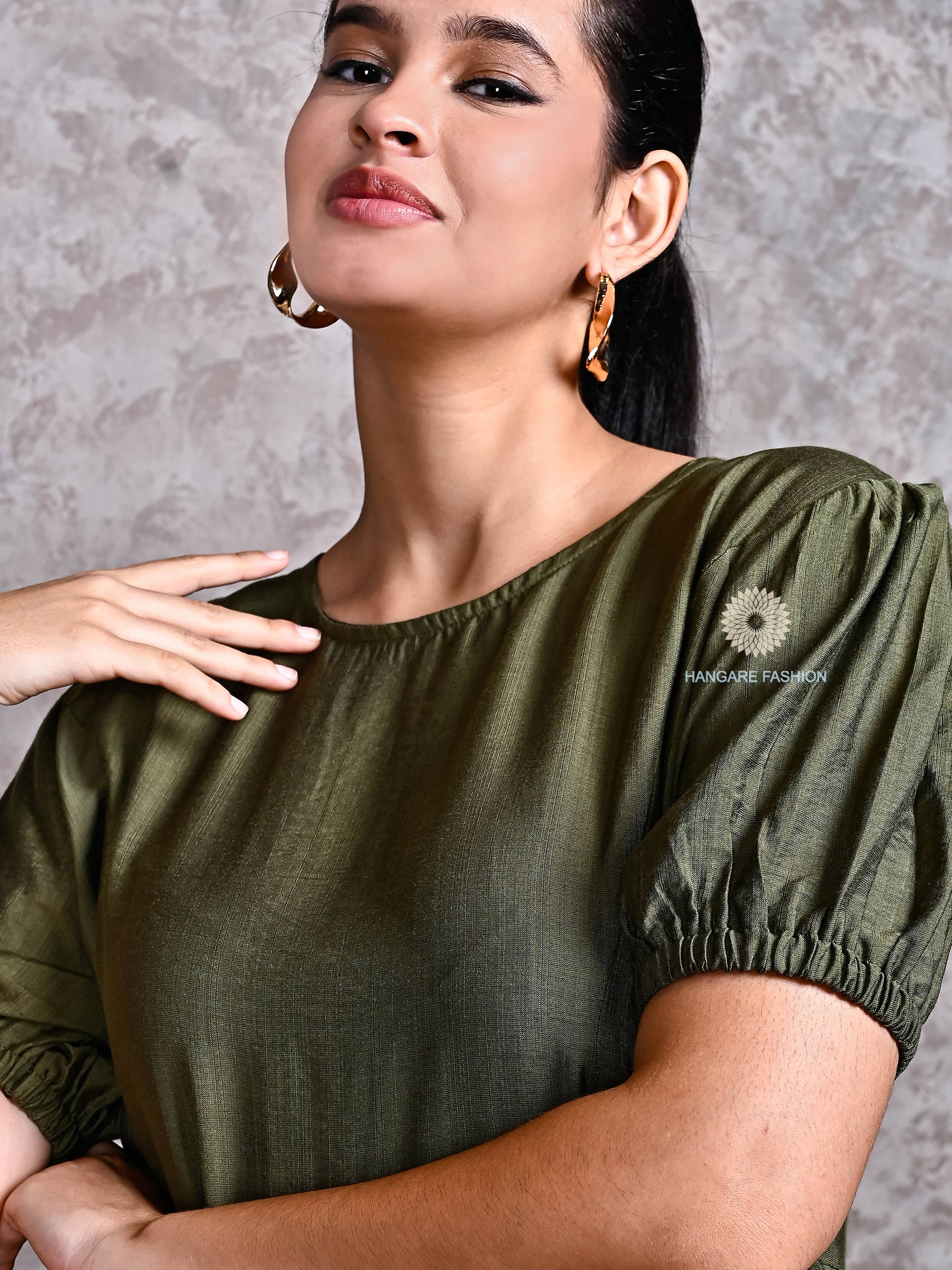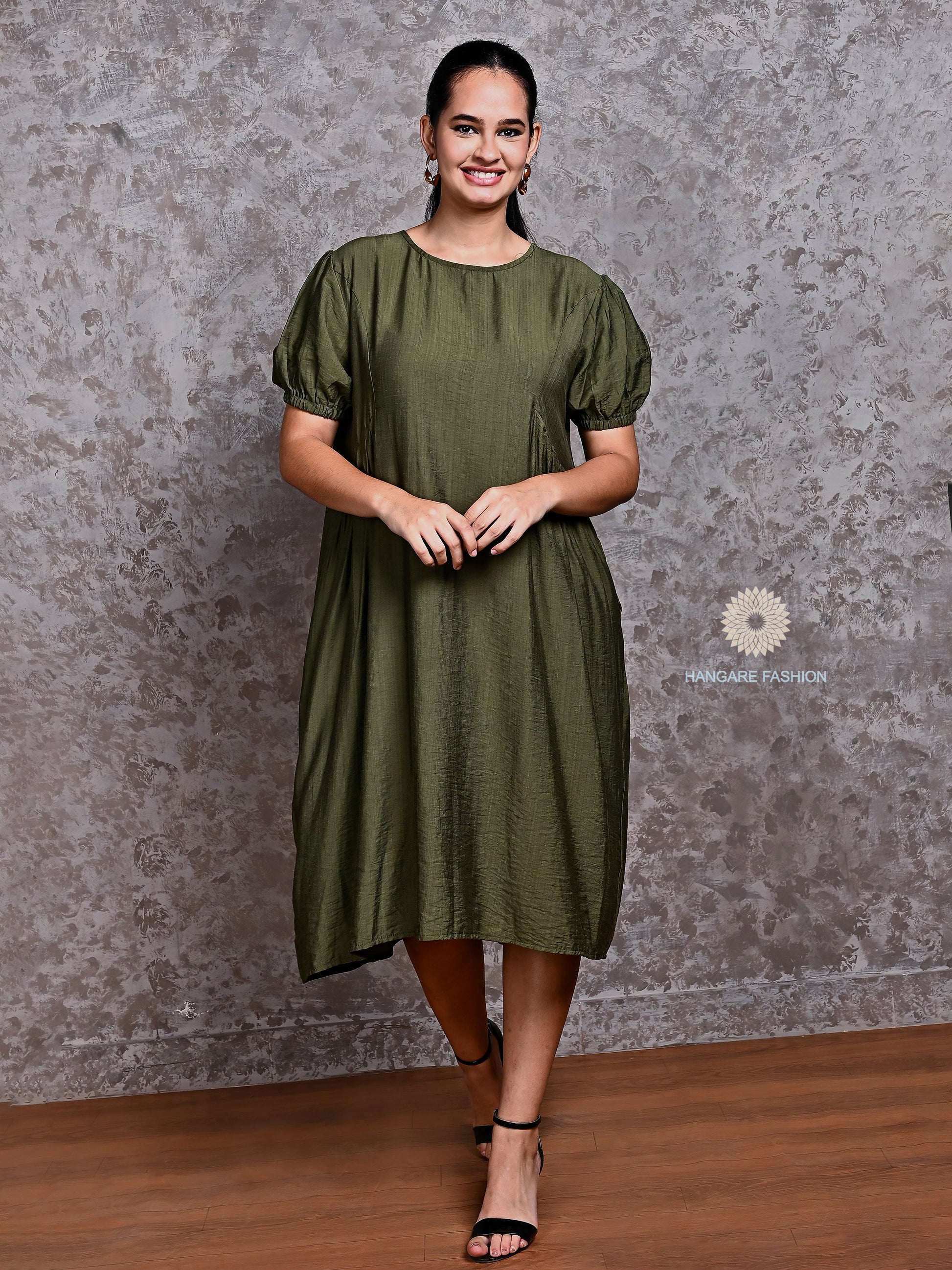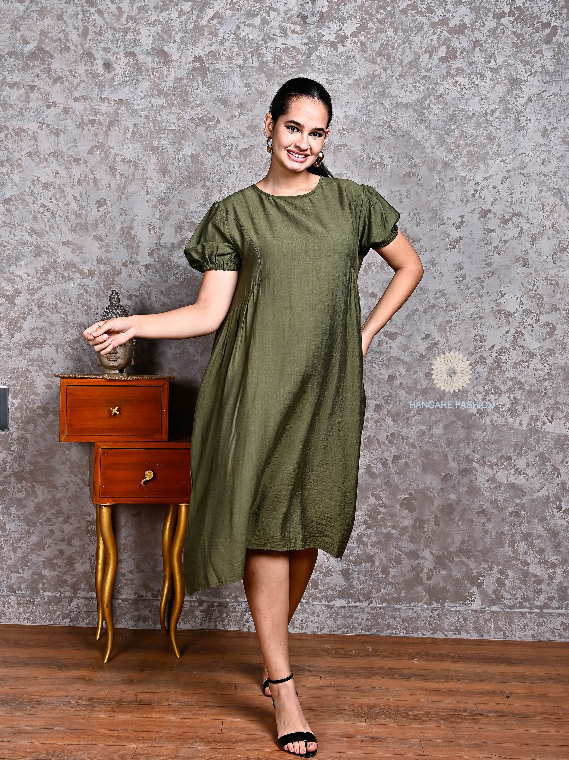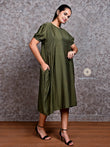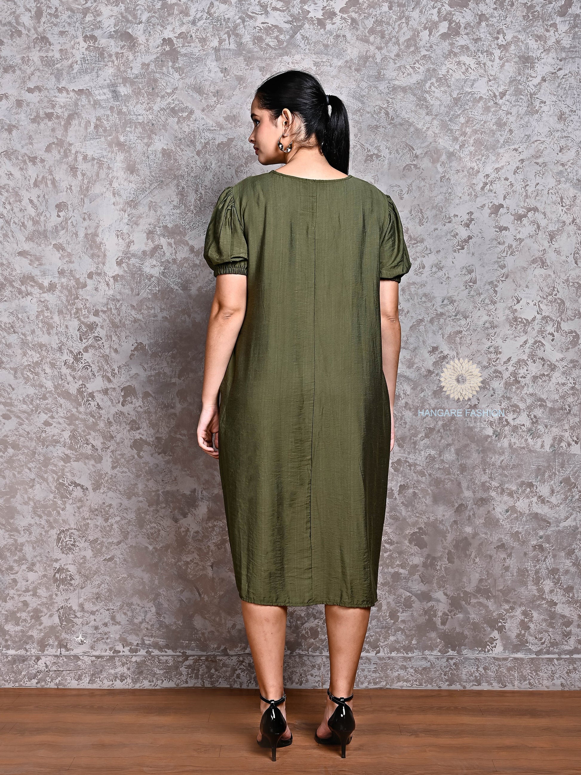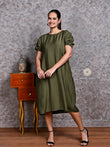 Olive Green Pure Cotton Puff Sleeve Midi Dress – Effortless Western Elegance