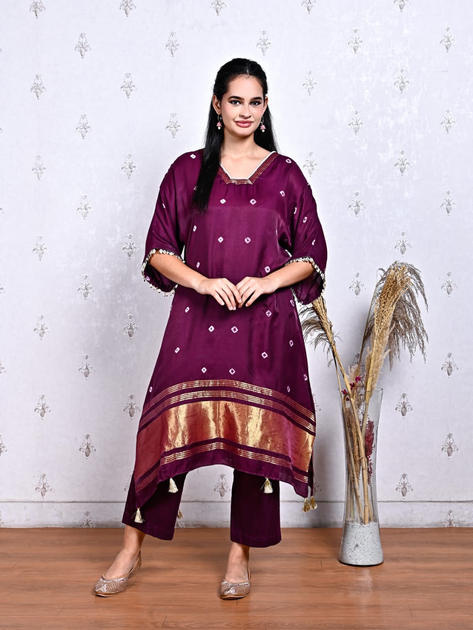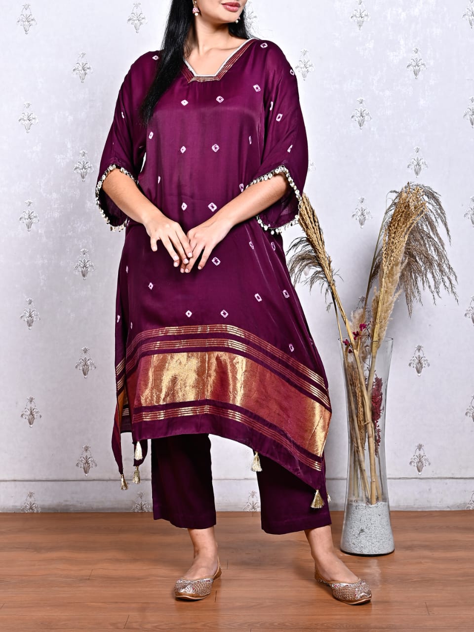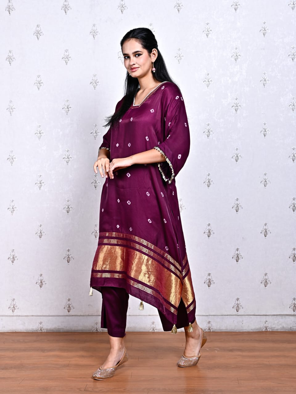 Purple Cotton Silk Bandhani Kurti with Pearl Neck Work & Pants