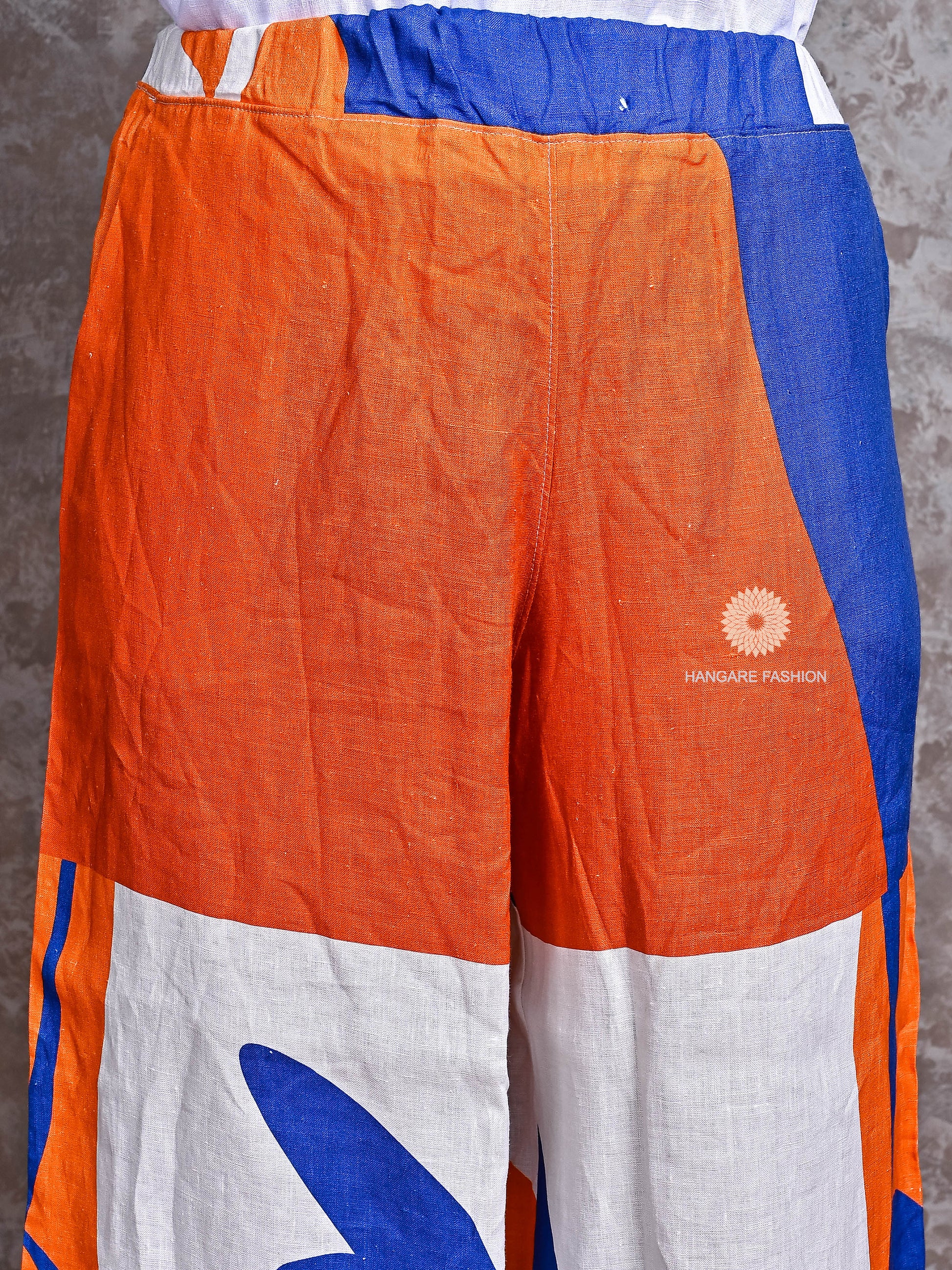 Royal Blue Linen Top with Orange-Blue Abstract Linen Pants