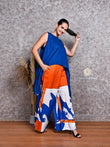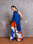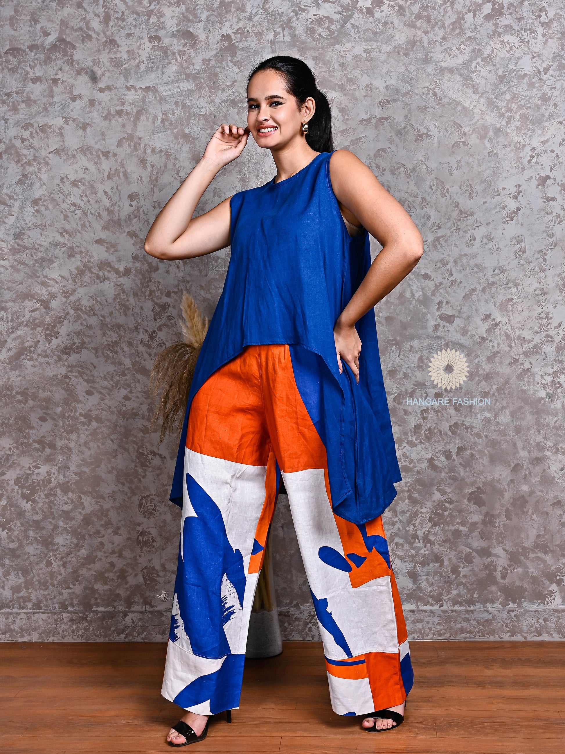 Redefine casual chic with this statement-making co-ord set. The royal blue sleeveless top, crafted from premium pure linen, features a stylish high-low asymmetric hemline for a flowy and flattering silhouette. Paired with wide-leg pants in a stunning mix of orange, blue, and white abstract patterns, this outfit captures the essence of contemporary art-inspired fashion.
