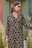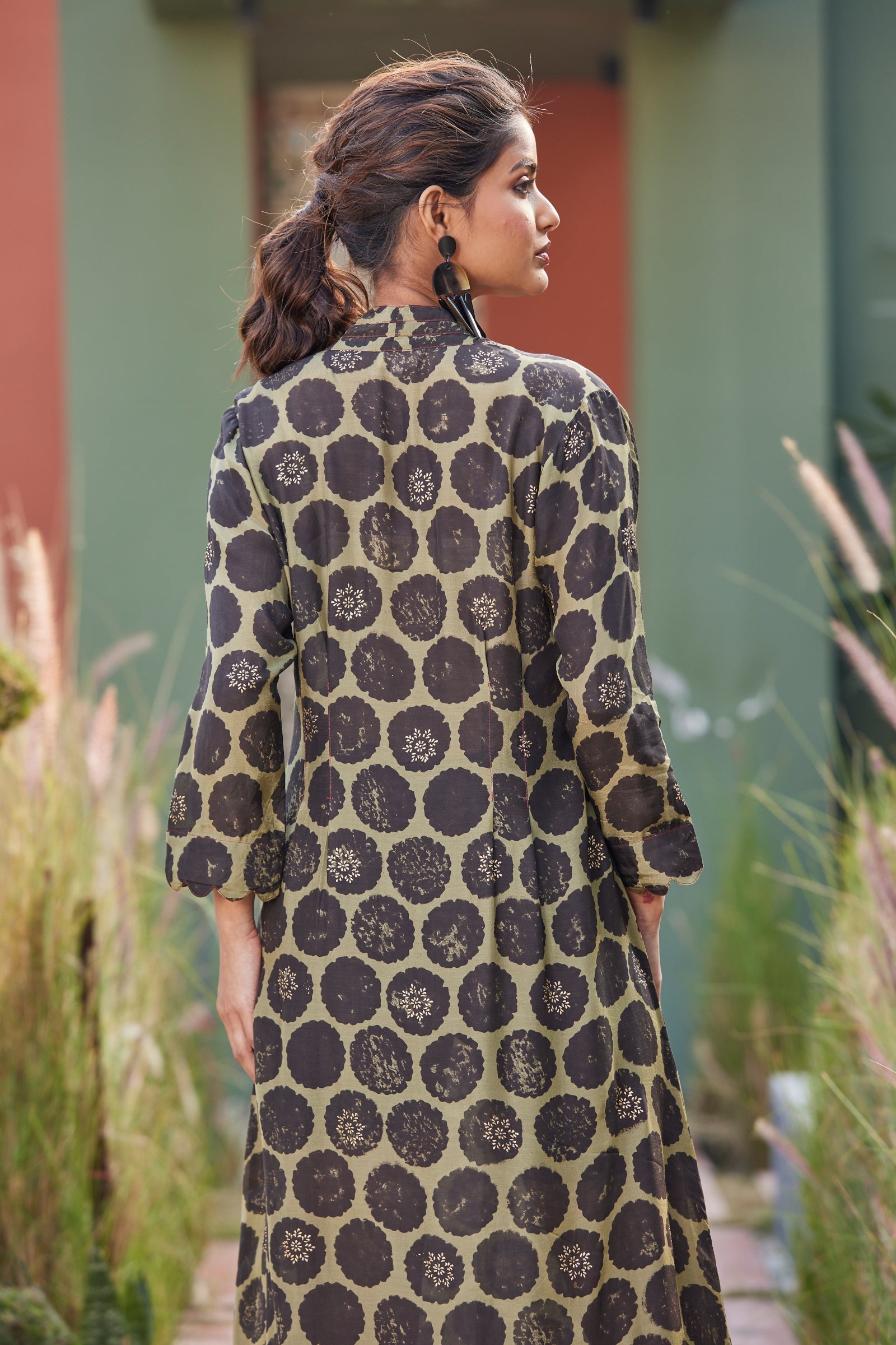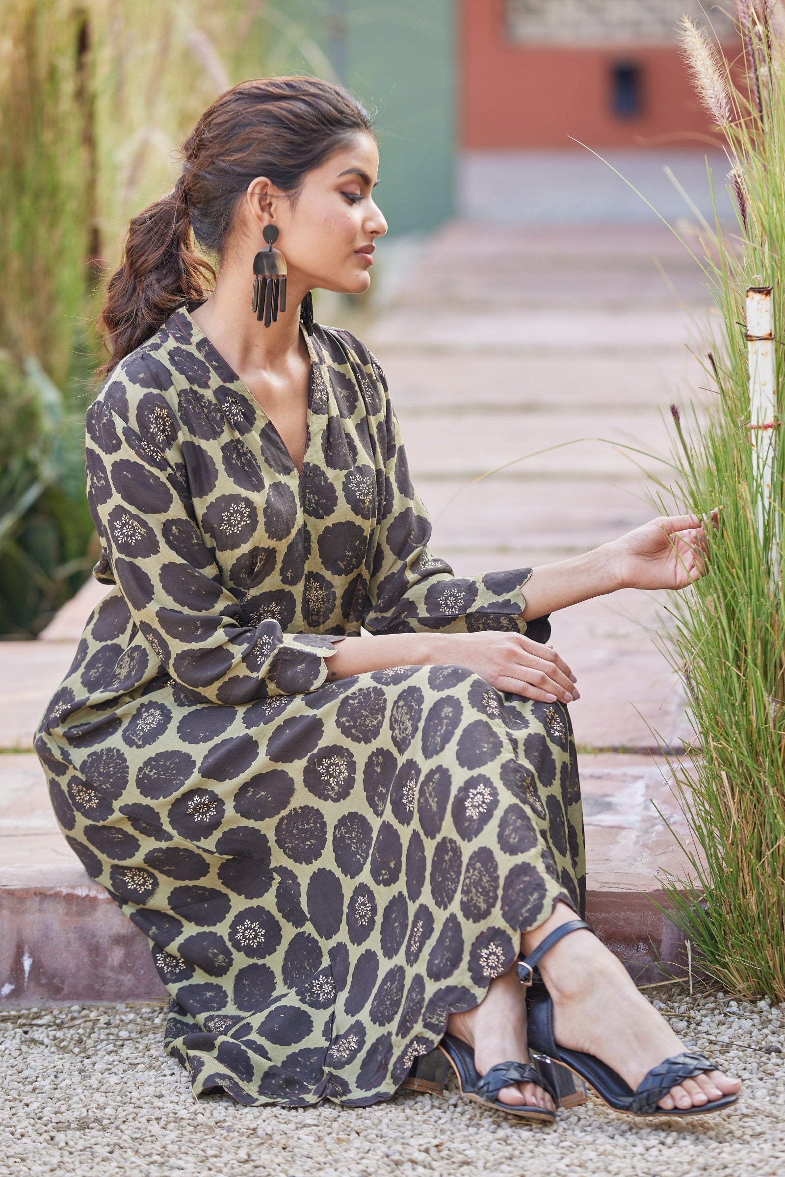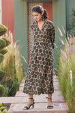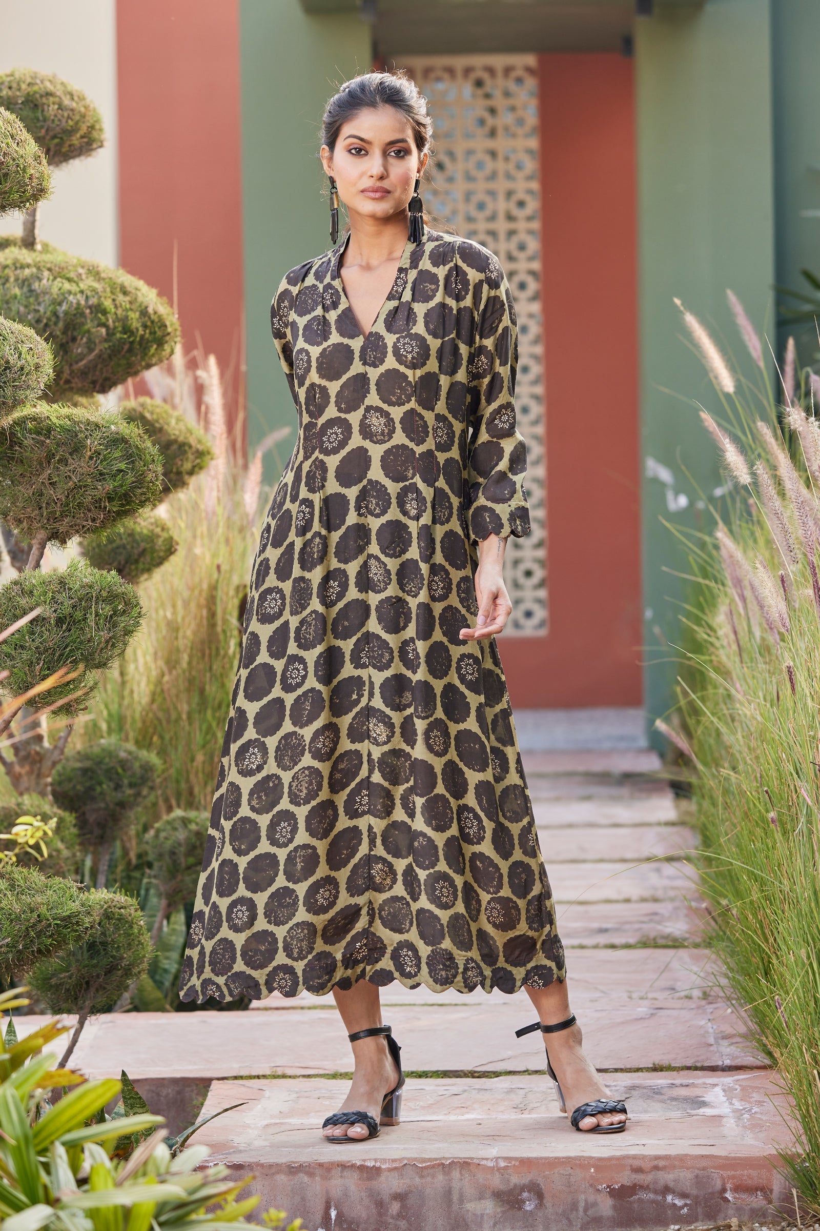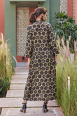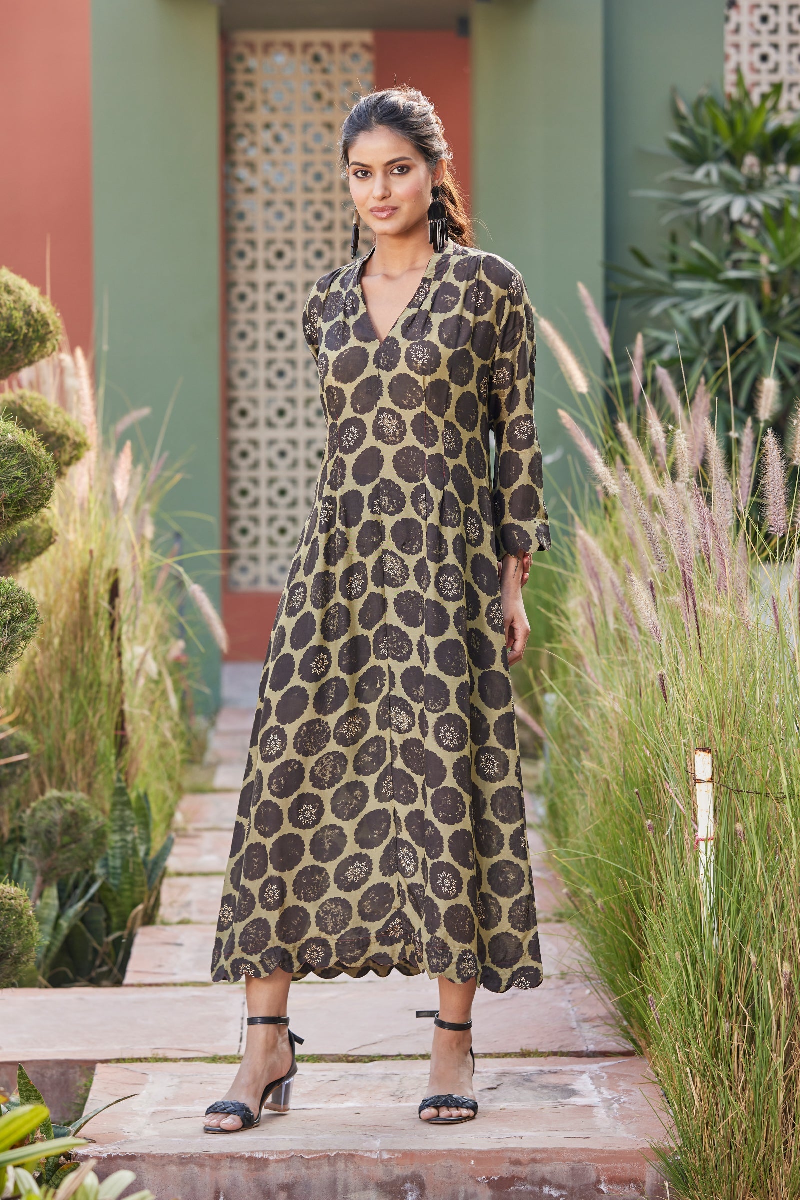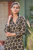 A leisurely fit, ravishing color palette and in-vogue V-neck…this dress is a true winner! Made from muslin viscose in our signature cut, this dress imparts a flattering fit like you’ve never experienced before. Featuring unconventional hand block print buttas highlighted with gold rogan, scallops on the sleeve and ghera edges, a dress as charming as comfy!