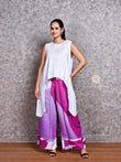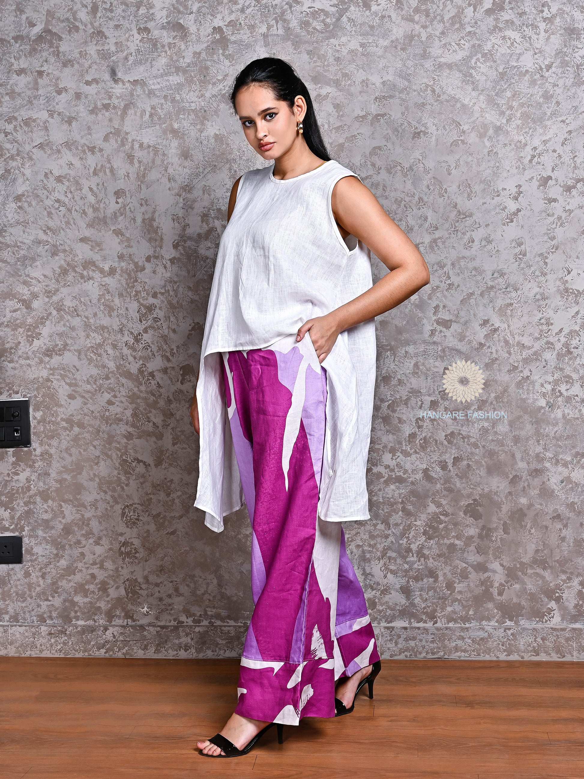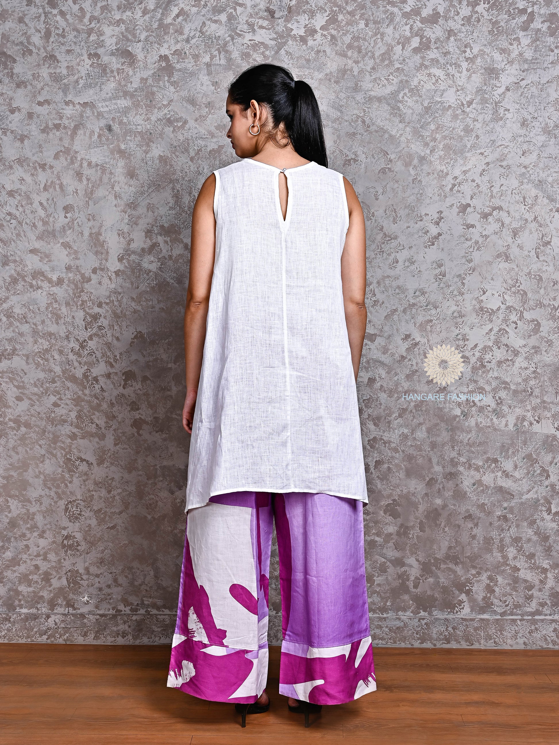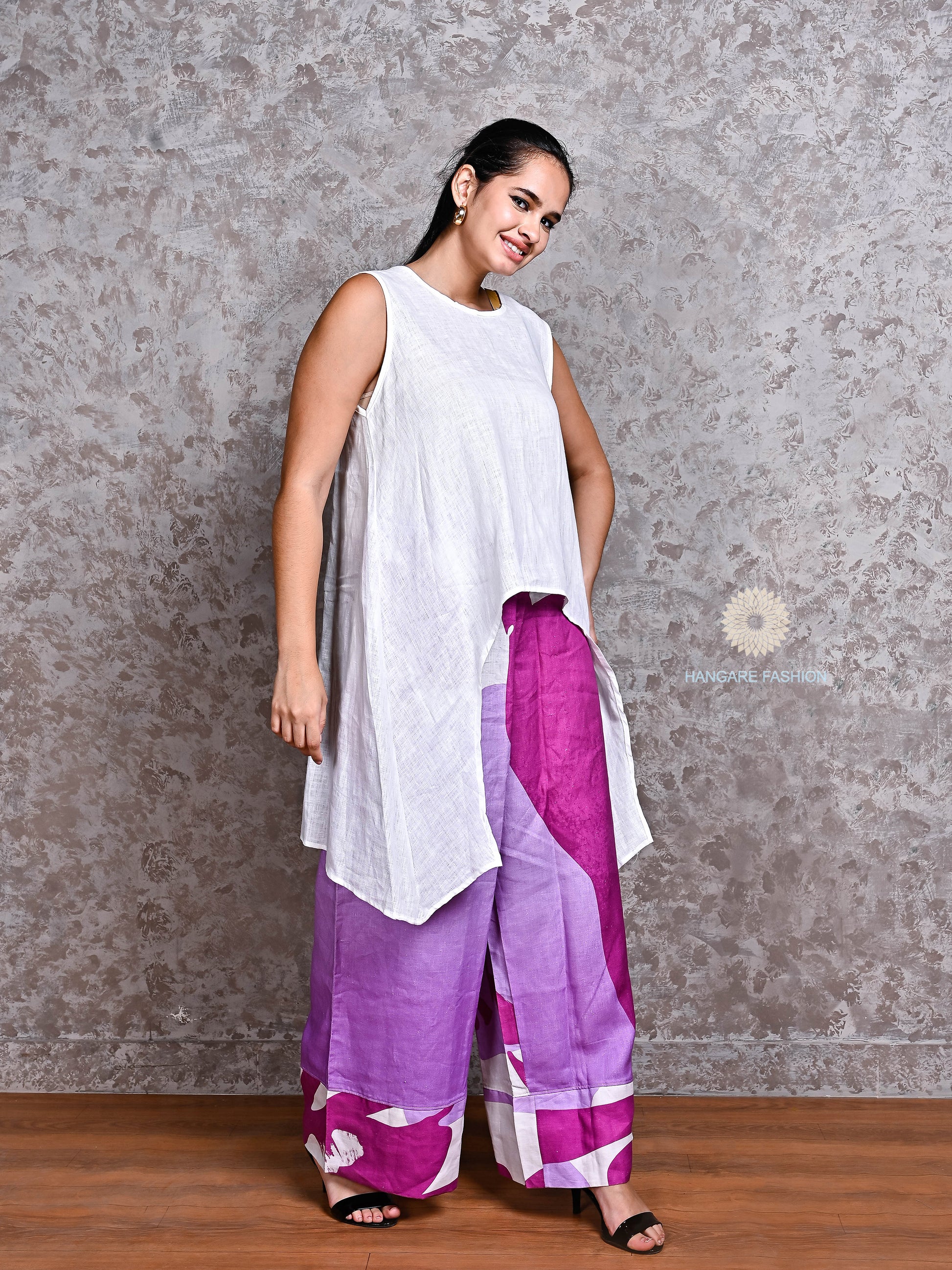Turn heads effortlessly with this chic and breathable linen ensemble. The top is crafted from pure white linen with an asymmetric hemline that flows gracefully, offering both elegance and comfort. Paired with wide-legged linen pants featuring a bold abstract design in shades of purple, lavender, and white — this outfit is perfect for brunches, casual outings, or creative workspaces.
