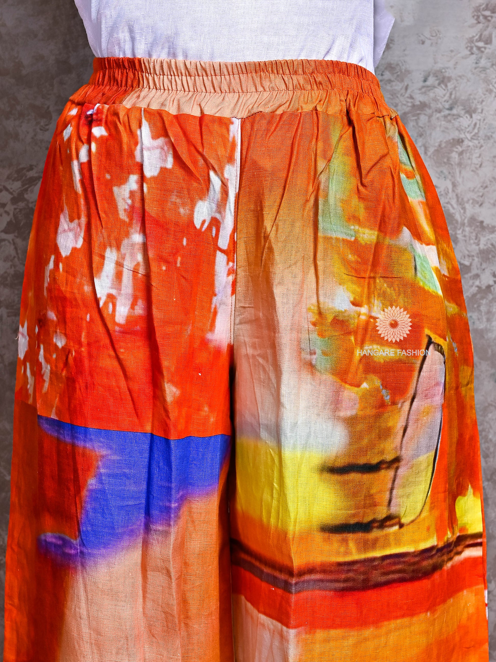 Pant Design: Wide-leg pants with vivid orange multicolor abstract print