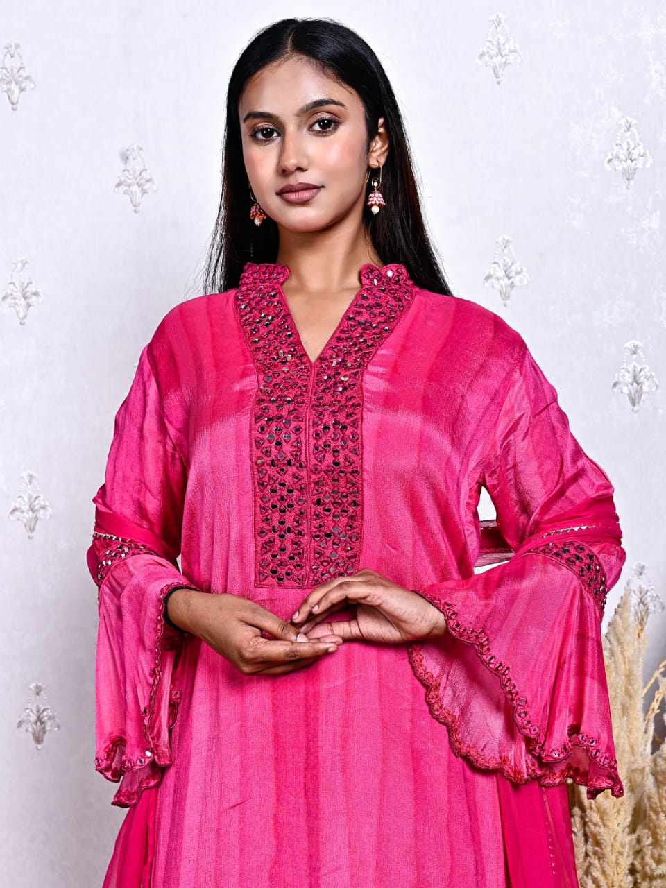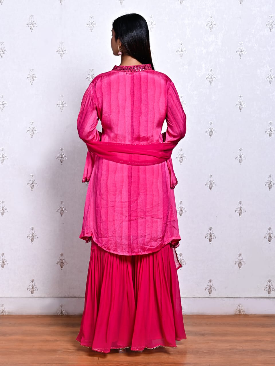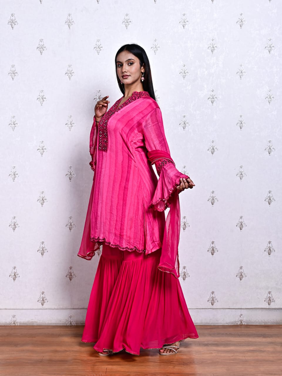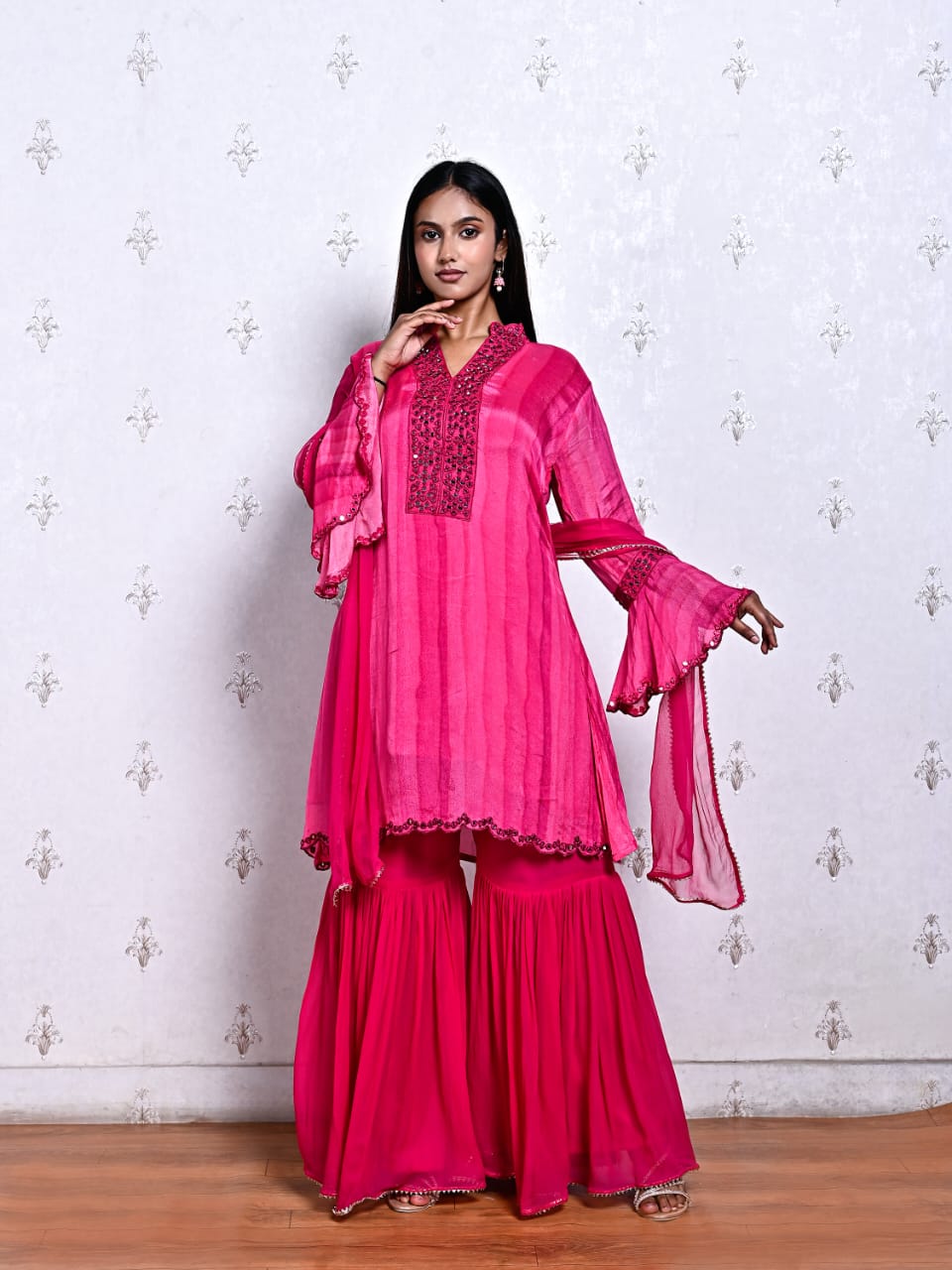 Women’s Pink Pure Chinon Kurta Sharara Set with Chiffon Dupatta